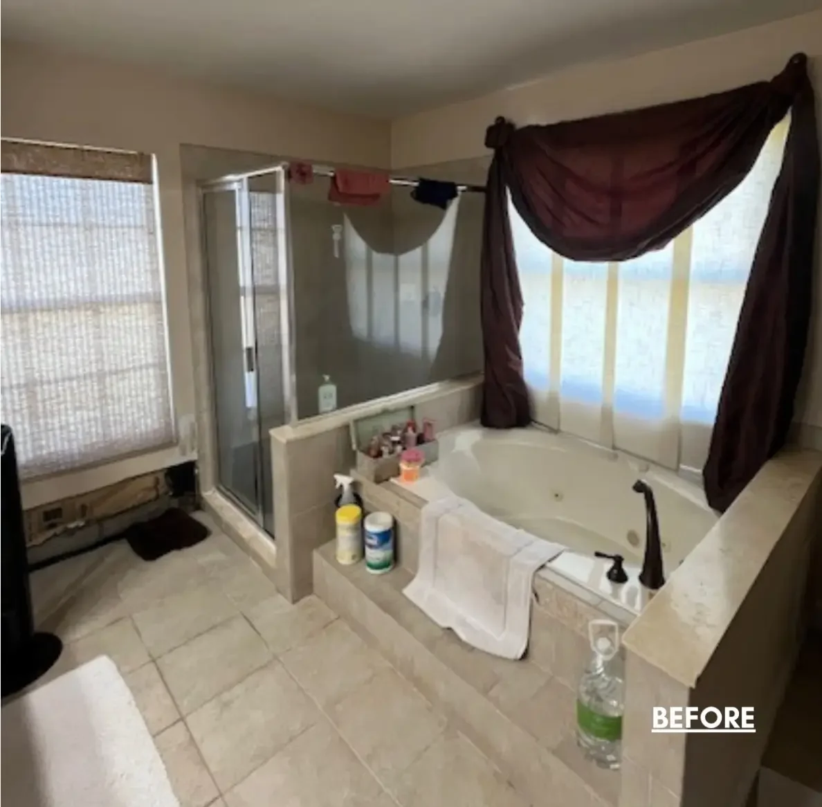 The lighter materials chosen, plus removing a large jacuzzi tub and installing a freestanding tub,