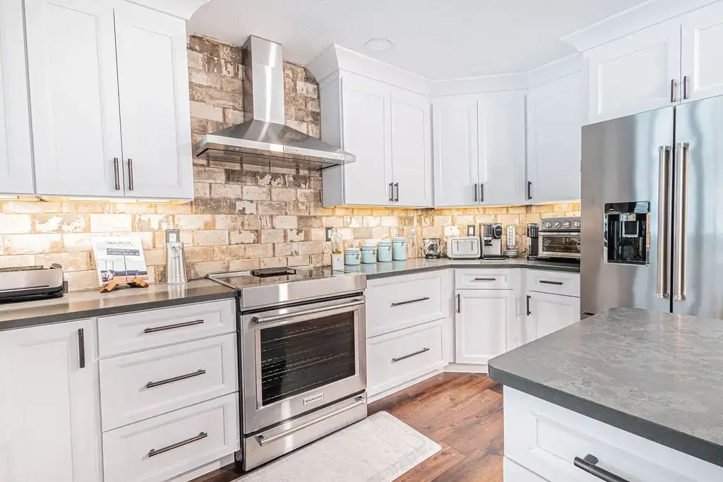With a minor redesign of cabinets, changing out the cabinetry, countertop, backsplash, flooring and replacing a door with a barn door, this kitchen received a transformation that is bright, airy and updated.